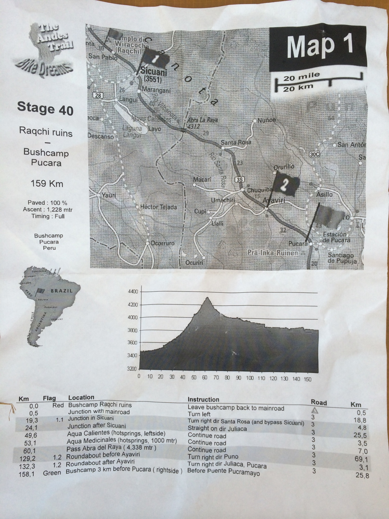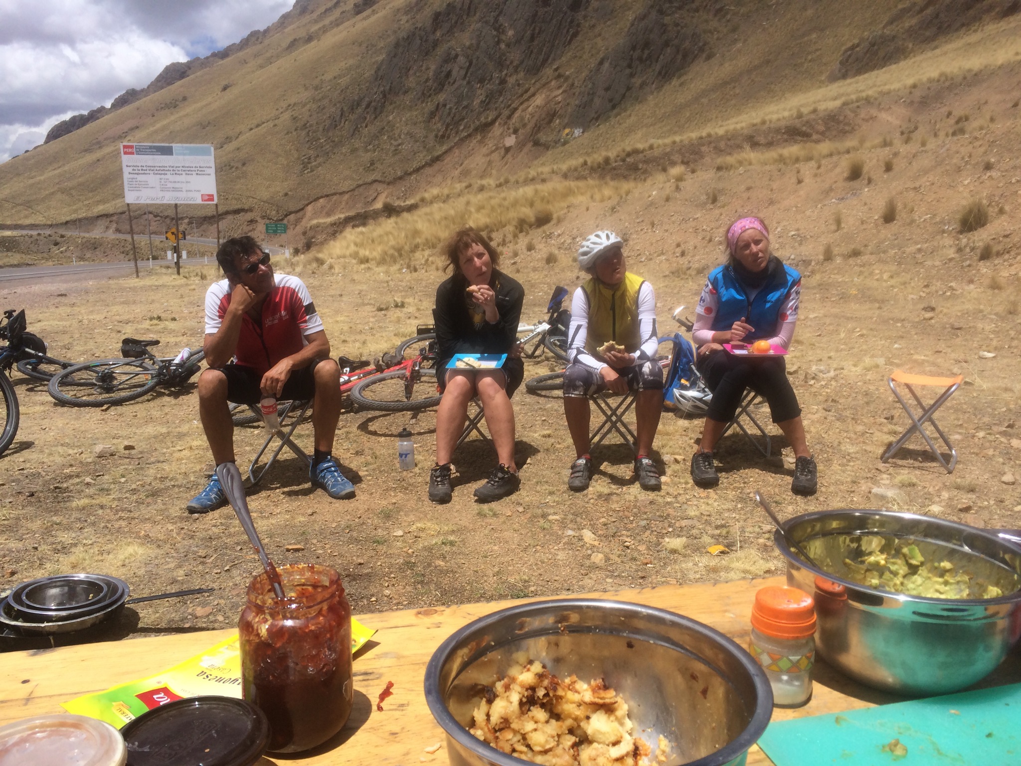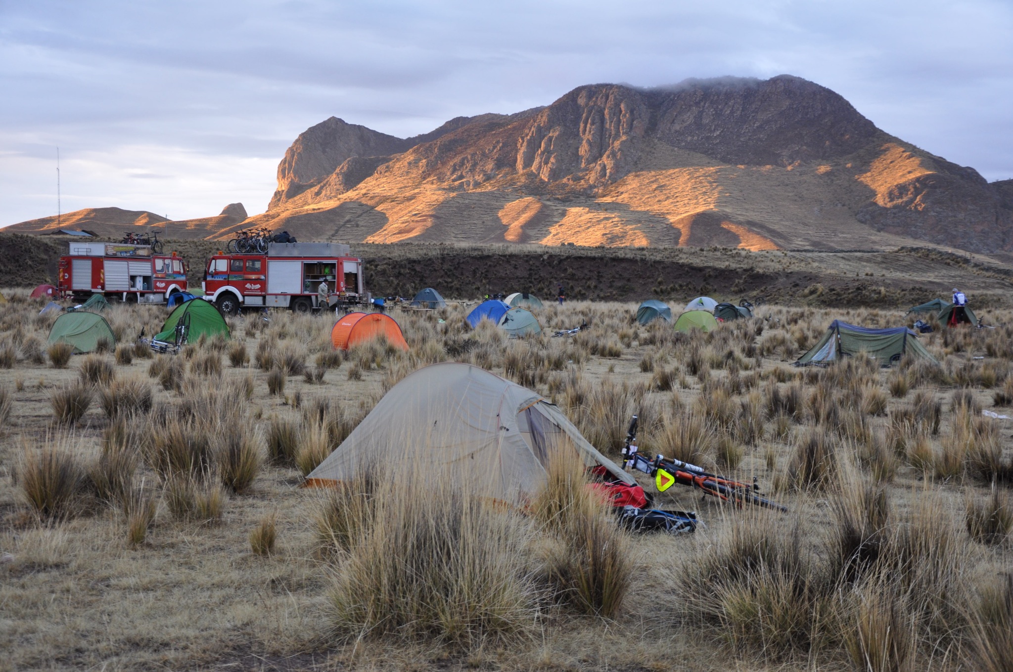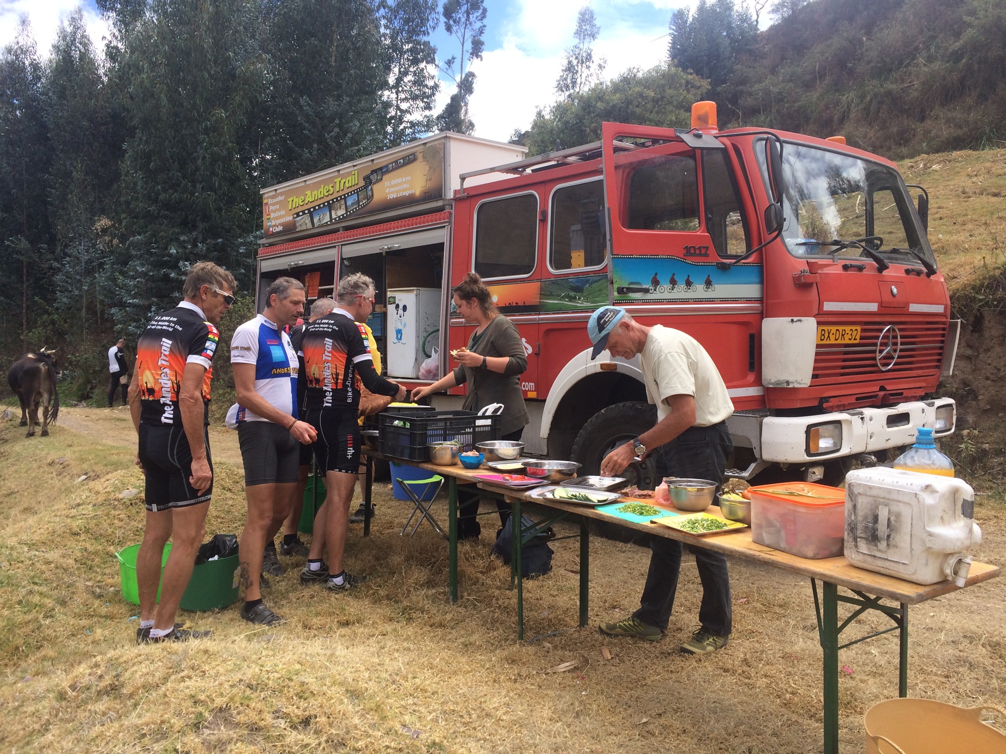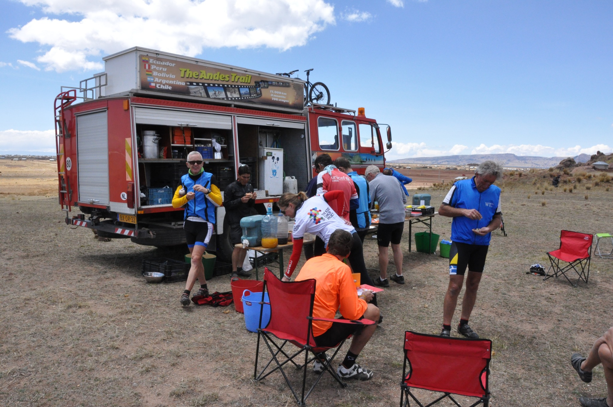 Our two trucks are converted fire trucks and designed to hold up to 10 people including the driver. Enroute out of town we stopped at a gas station filling up with 200 liters of diesel of which local price was $68, but we have to pay tourist price of $190. That is established as there is a different rate for tourists and locals. And fire trucks are not designed to drive long distances. One must admit it is unique to drive cross country in Bolivia in a fire truck. Today there were 8 of us. Robert the driver, Maria his wife, Ellen our cook, and in the back Cristen from Norway, Elizabeth from Australia, Vivian from Australia who started in Quito but had left in Cusco for her daughters wedding in Sydney returning to trip in LaPaz, and Barry from Australia, and me. 135 kilometers later we are what we call a bush camp. Just camping beside the road near a village where there used to be a hotel but it is no longer there. Robert went and checked with the mayor ( or whatever the official is) and asked permission that we camp in the futball pitch. The mayor came and met us ( none of the bikers had arrived yet) and he seemed impressed I was from Alaska, the land of the white bears. If it rains hard it may be a bit muddy as the ground is just dirt.
