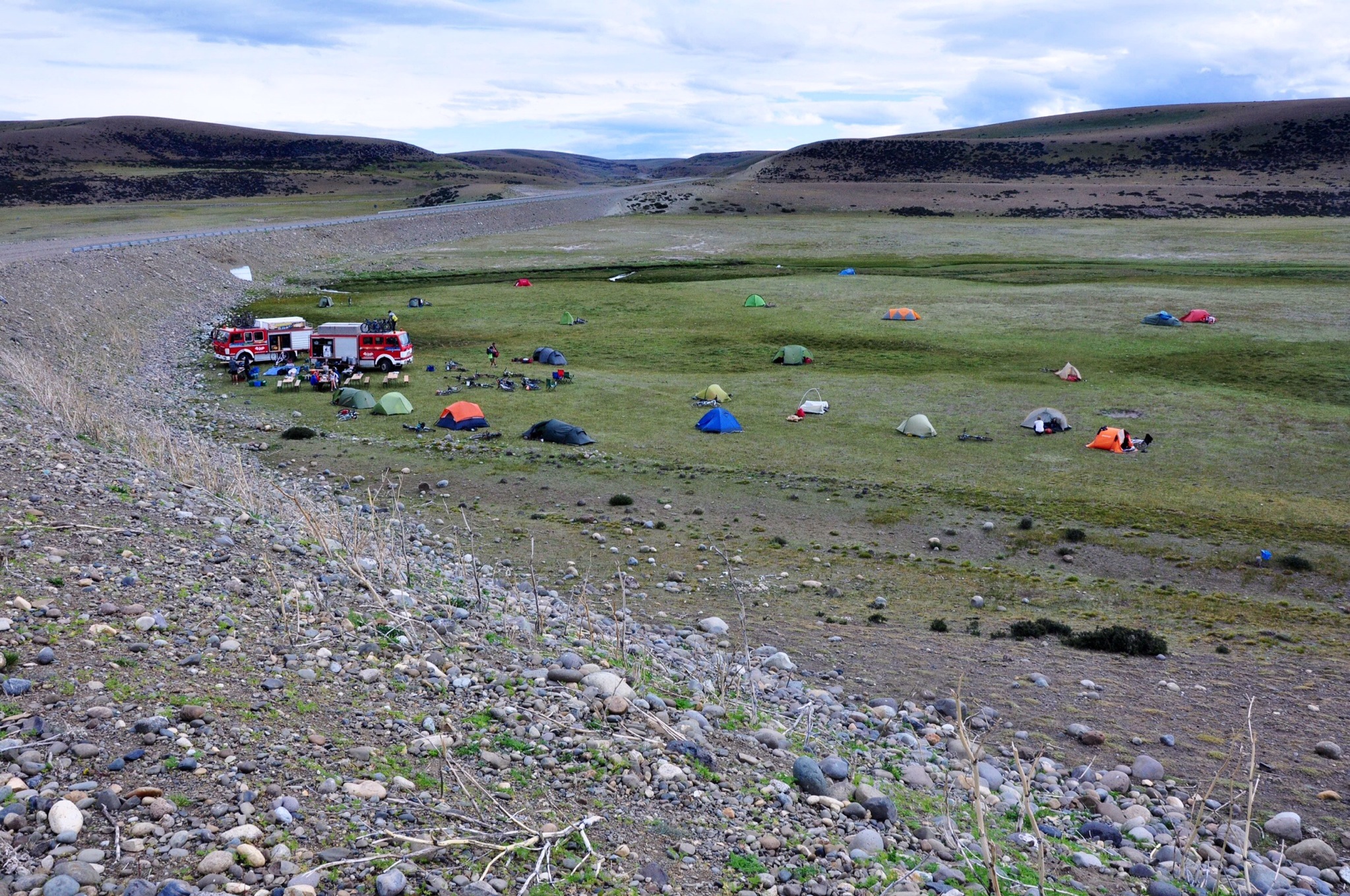 Then the climb of 900 meters 10 kilometers long and lunch. I was moving along. Expected nasty winds after lunch but flat with some slight downhill and proved very fast riding. On e we topped the hill the country just became wide open flat country. Michelle and I joked that it was excited to see the emergency road poles placed about every 10 kilometer with an emergency phone. It proved some diversion as nothing else to block the view. Then a final 30 k of not too bad gravel and a bush camp. 30 kilometer earlier than past camps which were at 160 kilometer but no longer available.