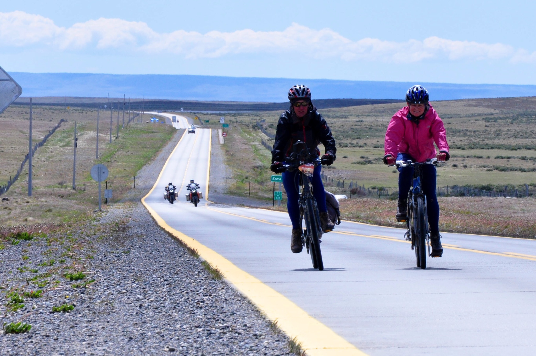 Not a bad ride first part without wind and gentle hills but mostly described as flat, wide open country. Temp was 8 degrees so not too bad although a bit chilly as I had dressed for warmer. Got to pavement and slight uphill reaching summit at about 60 k and the wind was blowing into us and felt cold. By lunch it was downright cold despite temp going up to 11. Put on all clothes and proceeded to borders which were relatively easy. Had a good laugh with Argentine border guards who said I looked like John Connor. My response was “I’ll be back”. (John Connor is a character in the terminator movie series.