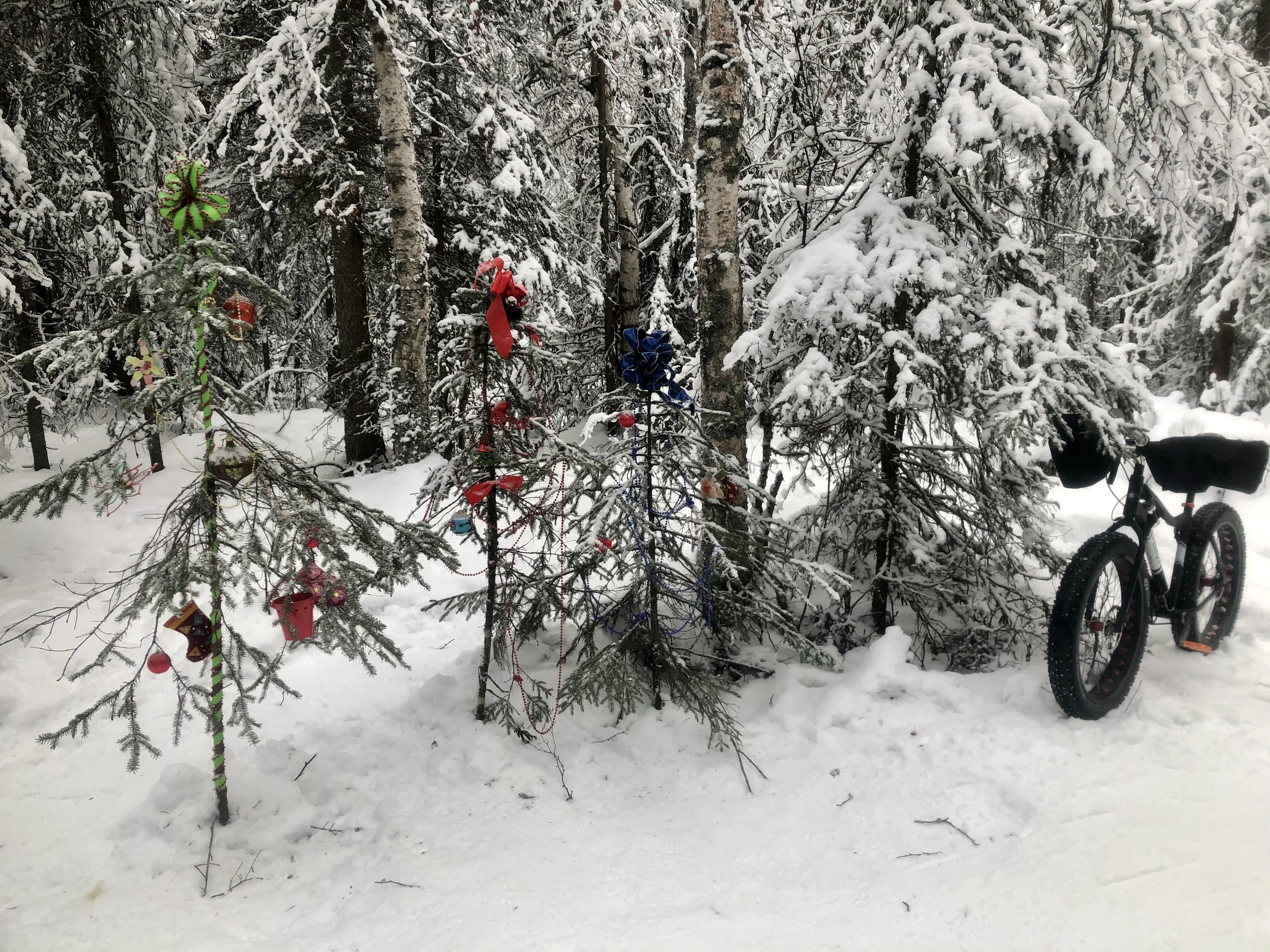 But in the riding around the delightful trails here one comes across decorations scattered about. And some bikes have decorated themselves with Christmas lights. Just because there is only a short window of light does not mean one cannot get out. Today’s flashlights, headlamps, torches and such leave no excuse for limiting ones time to daylight.