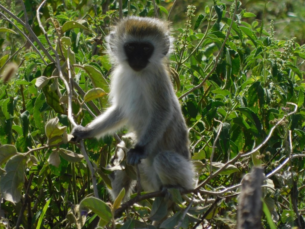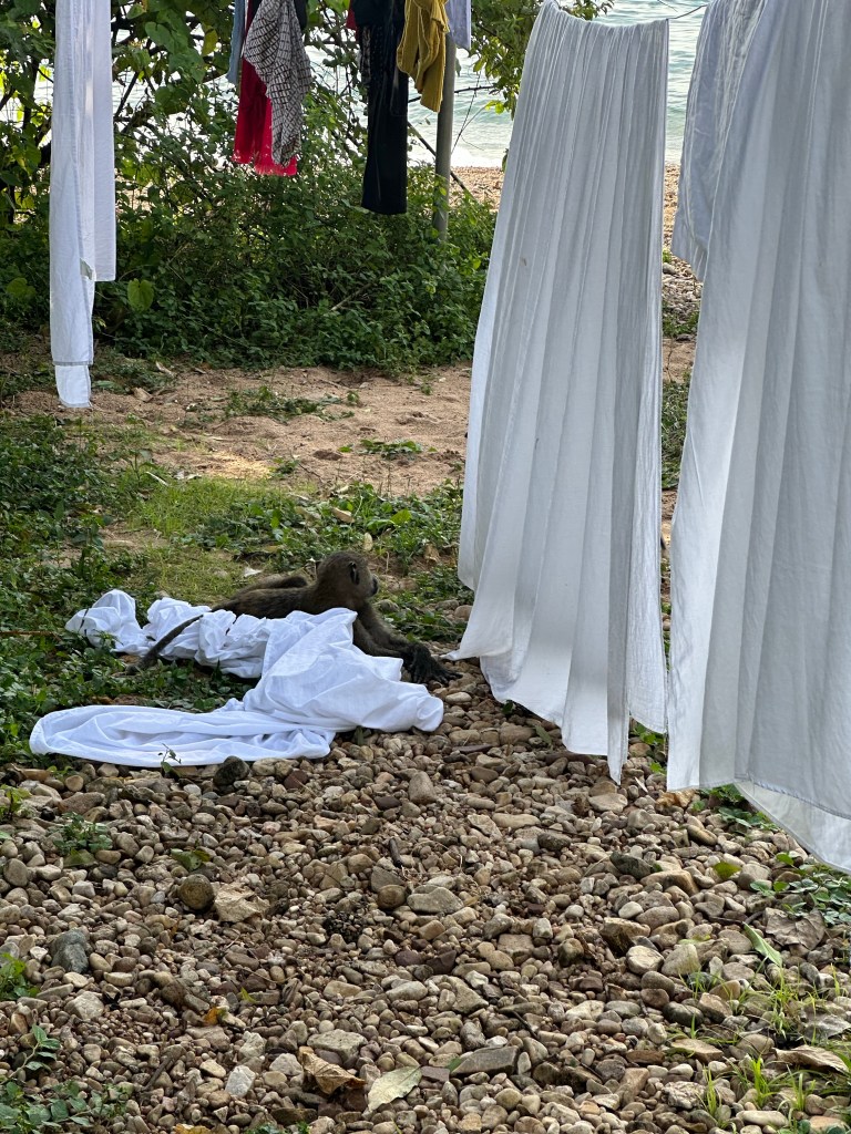 The baboons frequented camp and were fun to watch. When camp staff did laundry (by hand) the baboons would pull it off the drying line and either lay on the sheets and roll around seemingly to play in it. One baboon sat on Dave and Cindy’s tent beneath the metal roof escaping the rain. When Dave poked a stick at tent roof other baboons came in thinking this was great fun.