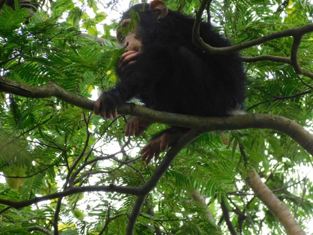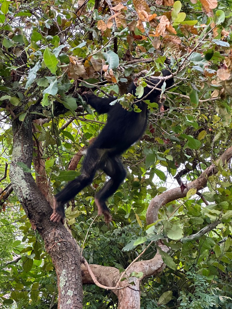 Second day and Jeanne opted out of todays trail. It was another strenuous climb this time more straight up by with steps in trail, although maybe a ladder a more appropriate term. Sweat was pouring from us. Then Hussein says just around corner, on go the masks and another hour of viewing. This time the chimps were more relaxing laying about making an occasional nest (tales 3-5 minutes of breaking and bending limbs). All the chimps are known to the researchers and we learned ages and histories. Gimle came down to a limb and laid out just relaxing occasionally crossing and uncrossing a leg or arm, just 4 meters from me. After maybe 10 minutes the alpha male began a call and all arose and began movement elsewhere. Gimle arose from his “lounge chair” and walked down the trunk right next to me, totally unbothered. (I have learned from the news media no one or thing much cares about my existence)