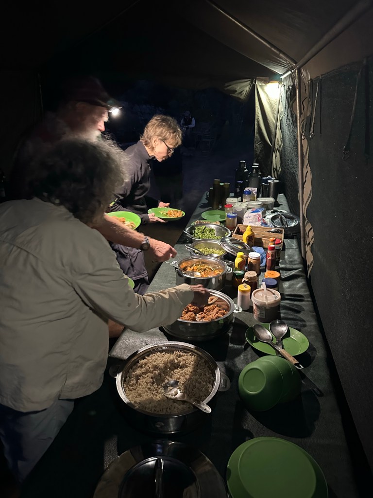 Back to base and an afternoon of relaxing. Power is on only from 7:30 to9:30 pm for charging phone, cameras, batteries, etc. and only one plug in tent, thus judicious planning is required and a headlamp.