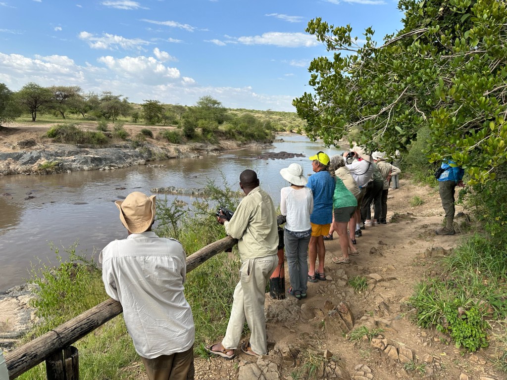 GiraffeMigration. We sat here 45 minutes and it did not diminish horizon to horizon. There are 2 1/2 million Wildebeast in the Serengeti which is 5760 square kilometer (about 3500 square miles. )Hyenas vultures on Wildebeast taken by lion earlier. (We know it was a lion as saw it as hyenas took it away)Hippo poolHippo pool they sleep during day and graze on shore at night. Arrival at hippo camp