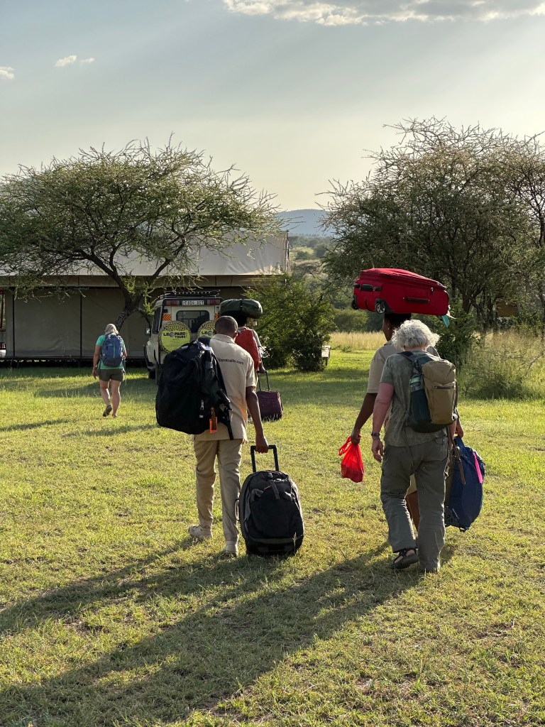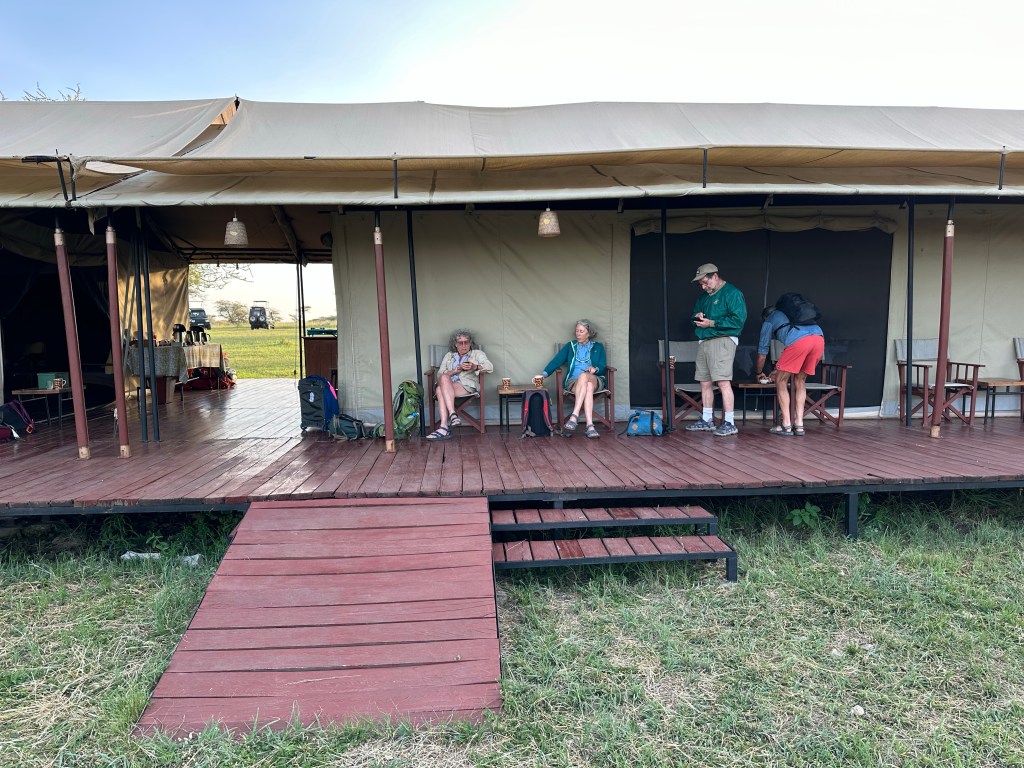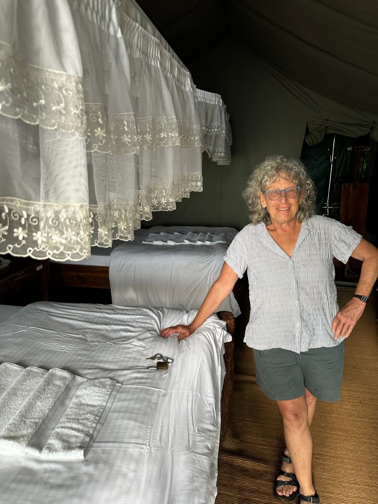 Food was as Cindy described typical Tanzania. Always fish and rice but sometimes French fries, a meat sauce, peas, beans. Nothing exciting! Our group would gather at the “party barn” (Jeanne’s and my tent porch) for a pre dinner before dark get together. We were one of two tour groups, the other a couple from Germany who had been told credit cards could be used. (Unfortunately since no electricity available credit cards unusable. ). I gave the Germans 100,000 shillings (about$50.00) as they had no cash for tipping. (They transferred payment to me via PayPal).