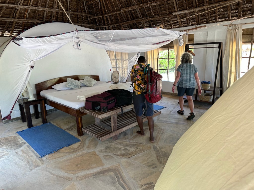 Flew from Arusha to wherever this is on coast, arriving at nice grass strip and met by lodge with van and trailer to haul us to lodge. At the lodge met us with fresh coconut drink then ate the coconut meat. Seems all the lodges meet you on arrival, as if you are the most important person in the world.