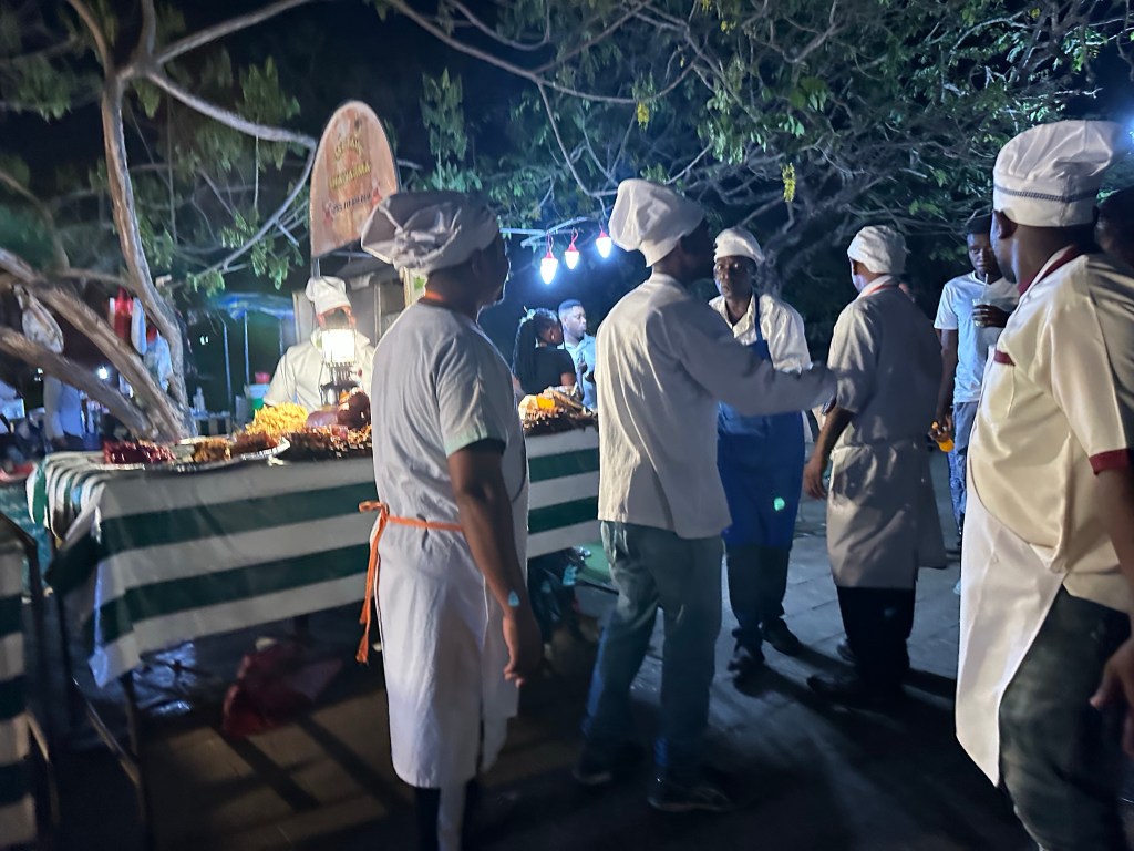 The first night out we went out to eat at the night market. As Cindy describes it , 4 parts entertainment and 1 part food. And I might add delicious food. Reminded me of pikes market in Seattle, but not so sedate, very active. Pikes market on steroids. I got so many hugs from the cooks and hand shakes, and was well taken care of. I finally settled on lobster and prawns with garlic chipati, all barbecued exquisite. The cook made sure I had a seat to eat at. Great fun, but one must have energy for such activity and it is hot. (Upper 30’s(low 90’s) with humidity)