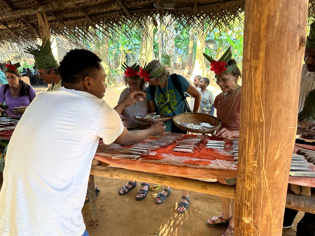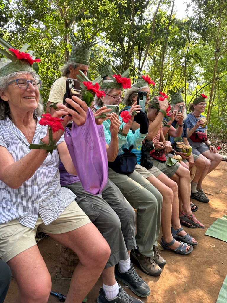 That afternoon we drove to a spice farm. 10 hectares and they grow numerous spices there. Afraid I was very hot and my brain absorbed minimal, but fascinating. Ginger, cloves, pepper, numerous fruits, turmeric, coriander, etc. at the end of walkabout stall set up for buying. And a demo of coconut harvest. Amazing way to climb a tree. Wraps a cord between ankles and I suppose that makes the feet hold the tree, although our demo person was a total showman removing the strap and cavorting free. When finished they treat us to fresh coconut(milk and meat), watermelon (oh so good), papaya, and of course bananas. (Not cavendish). We received crowns, and ties from banana leaves. The kids came around and are kids. We had a good time.