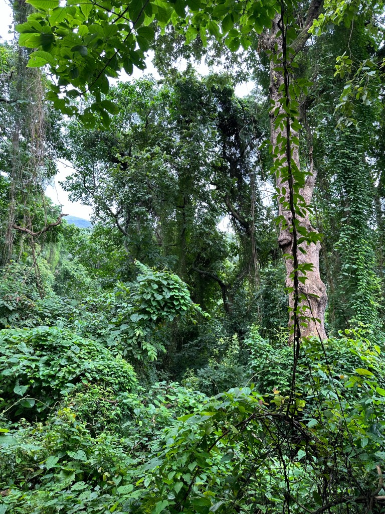 At the falls I walked into the falls totally soaking my clothes, but it felt so good and I knew would dry somewhat quickly. The jungle surrounded us and I kept wondering about “Tarzan” swinging through the trees vine to vine. Fascinating jungle, different than Panama or Bolivia jungle, but tropical jungle. Growth on growth on growth. Totally fascinating! One talks about alder bashing at home. That would be easy compared to attempting cross country without a trail here.