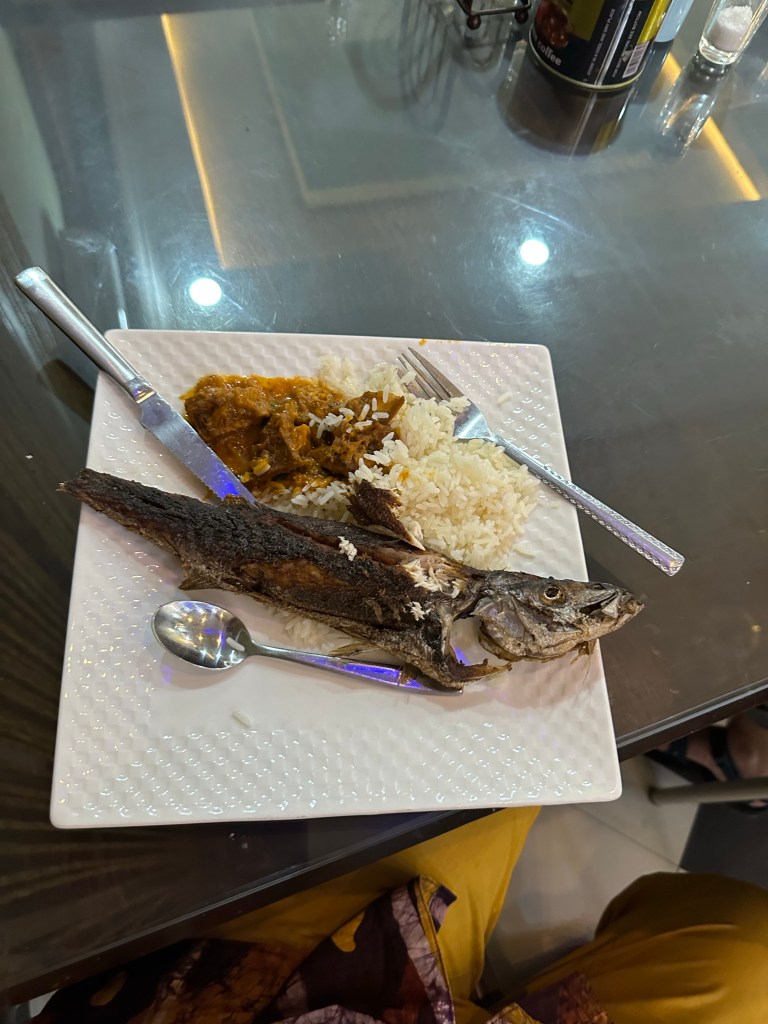 On to some more incredible traditional dancing. Incredible. Then a delightful hotel with some Wi-Fi, air con and showers although still no hot water (not really needed) excited about dinner and Hussein took us to a supposed high end Tanzanian restaurant. Alas in our estimation it did not meet our expectations. Fish rice, a meat fish and pea sauce. The same. Dory and Di opted for ice cream and French fries from a street vendor. Actually my dinner was good. Costing 12,000 shillings (about $12.00) A great sleep and now we have arrived at Dar es Salaam, a 4 hour wait for flight to Arusha which we flew over about an hour half ago. No direct flights.