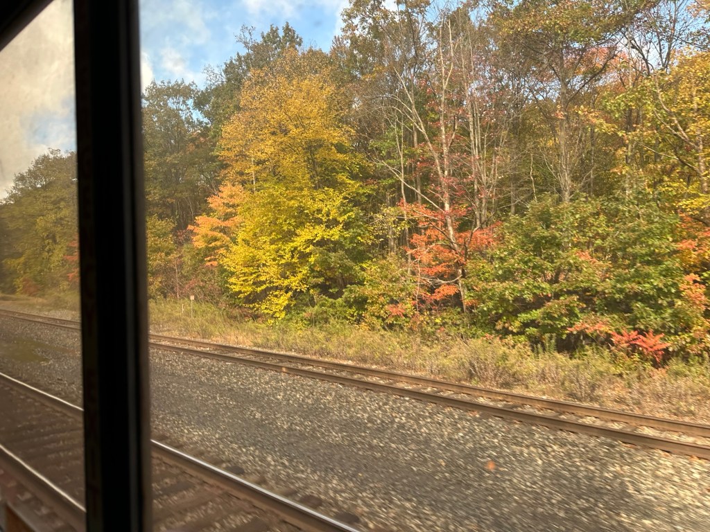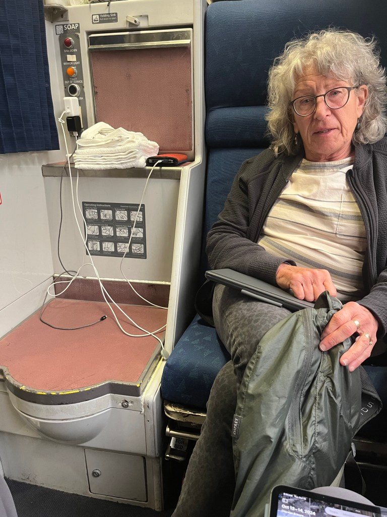 This train the lake shore express running along he Great Lakes to Albany then down to New York City. Surprised us at how different this train is. Whereas on the empire builder we had a roomette, this roomette is taller, due to only one level on this train. Hence upper bunk has sitting headroom and a window. And this roomette has a toilet and sink, but no closet, as if the 3” closet was great. We wish we had the community toilet as something about the toilet right next to bed, just is off. Funny how you beat best be careful,why you wish for.