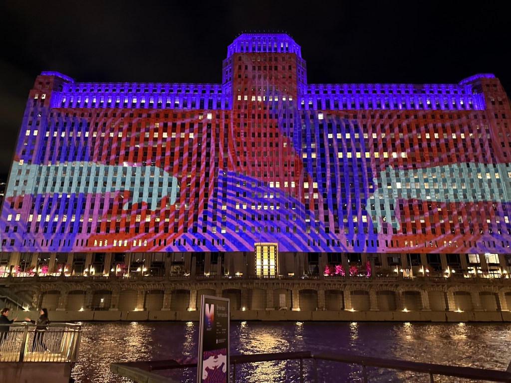 It was starting to feel like we were walking just to kill time, deciding to return to hotel for an hour or two before the “light on the mart” show. At 7:30. Originally had planned to go to the Shed Aquarium but tickets had her doubled in price for the marathon weekend, again demand pricing. We opted not to fall for it.