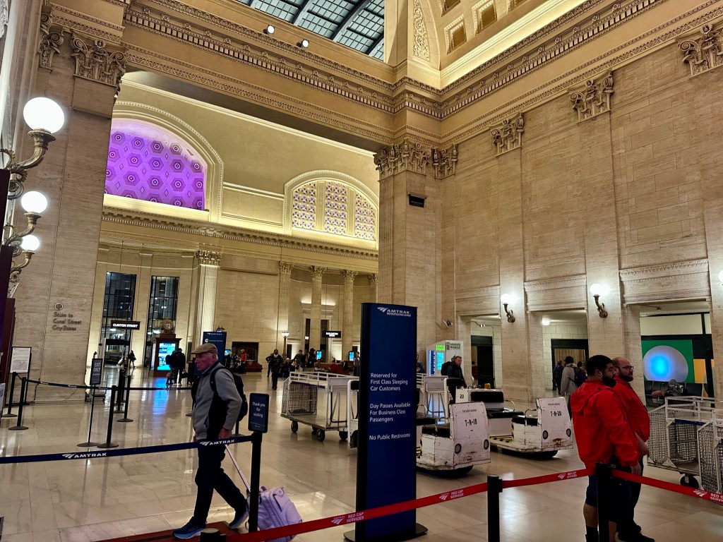 For security reasons, after Boston, could not go to finish line but we walked about. Turns out we walked about 8 miles just meandering about. Did the river walk, along river through town stopping for a beer along the way. Ended up at the mouth of river where dam lock is to keep Lake Michigan from coming into the river which creates some sort of problem. Checked out union station underneath for next days departure.