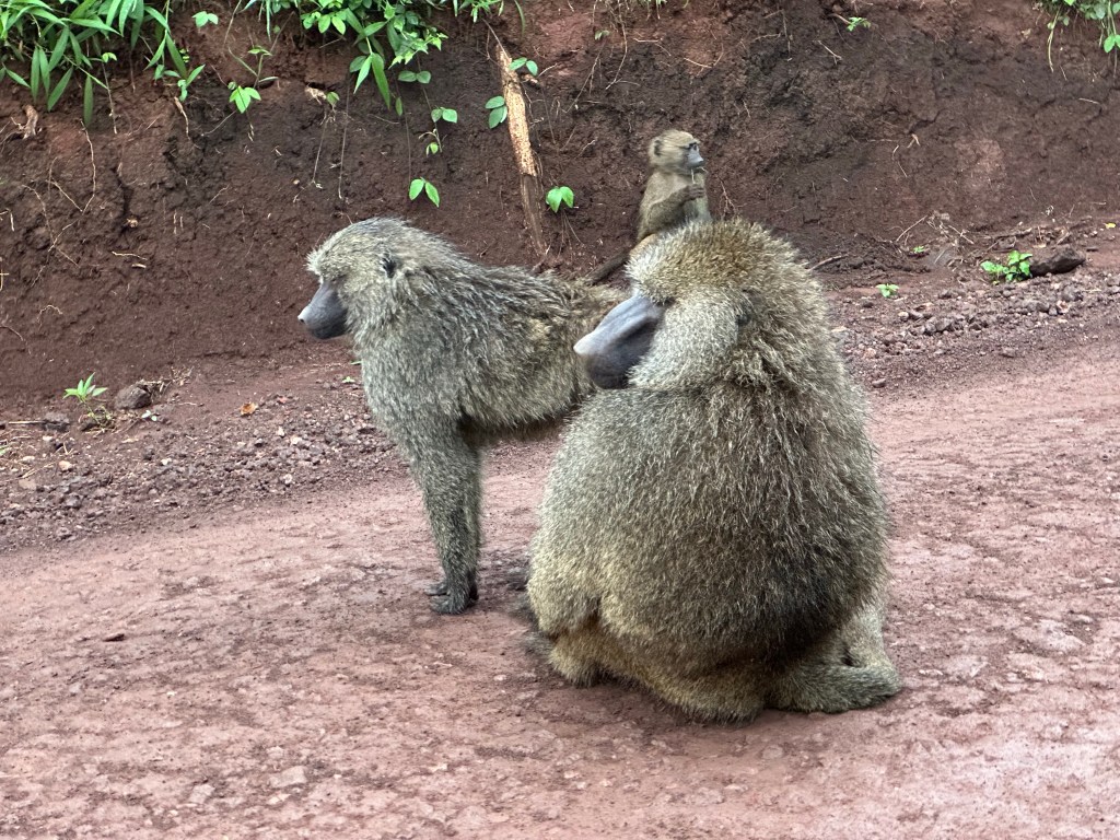 The baboons frequented camp and were fun to watch. When camp staff did laundry (by hand) the baboons would pull it off the drying line and either lay on the sheets and roll around seemingly to play in it. One baboon sat on Dave and Cindy’s tent beneath the metal roof escaping the rain. When Dave poked a stick at tent roof other baboons came in thinking this was great fun.