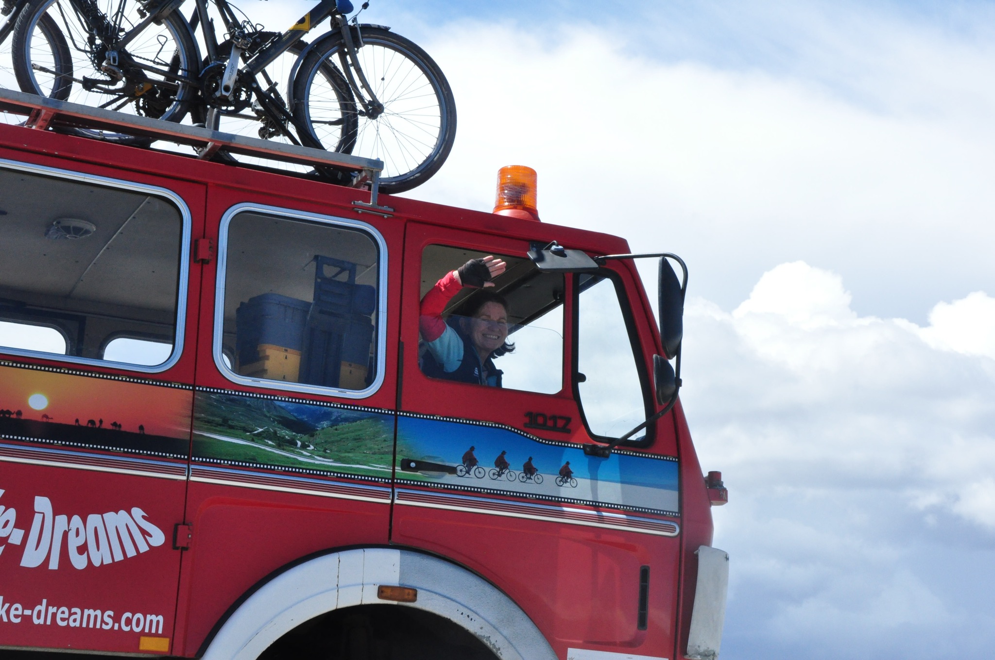 Riding along with Juerg and a gust caught me unprepared and blew me off my track and into a loose pile of gravel which I then over corrected for and totally lost control, going down. As I went down I saw Brian’s bike coming on me as he was immediately behind me. I thought, oh this is not good, bad enough I am bouncing down the gravel road and he is going to run me over, but he hit the brakes and skidded to a stop and never came close. Thank you Brian. He said he saw me get blown half a meter off my track into the gravel.
