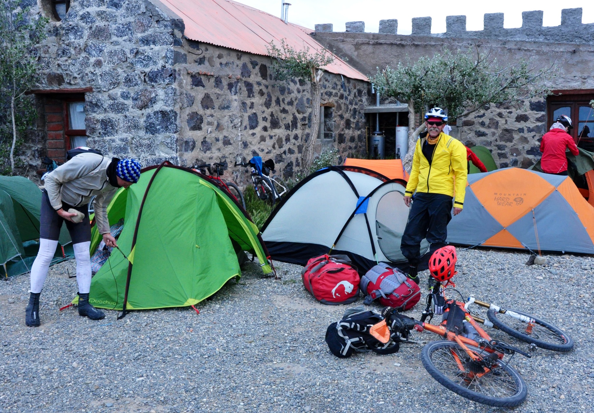 Camp is a building where they have seven rooms which were quickly taken, and a room where Gerdie can cook and we can eat. Tents are set up downwind all of us tight together up against wall of building with wind howling over the building. But cozy inside tent now, after soup and coffee, just waiting for dinner siren, still 1 1/2 hours away. That is difference between riding 130 k yesterday alone and 108 with group today.