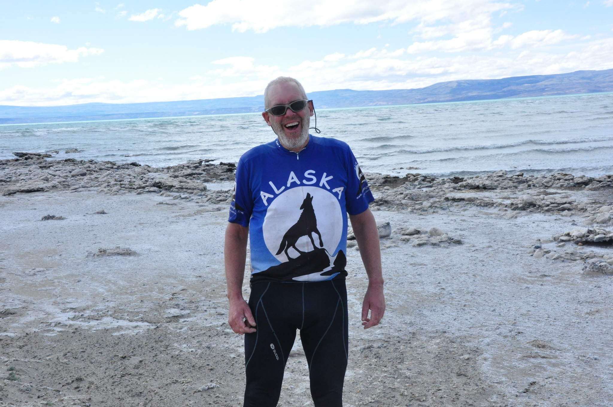 Then off with Ben and Tim to see the lake 6.5 kilometer off the road and. Nice ride down the hill and a pretty lake but wind, temp of about 15 and shallow kept us from going swimming but posed a picture.