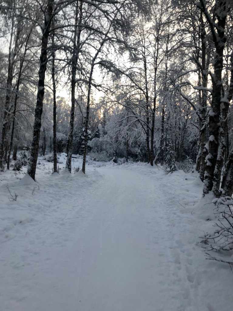 With temperatures a very pleasant -10 C (14F) the world is quiet and serene. Anchorage has a large variety of micro climates sometimes ranging over 29 degrees C (50 F) over a 16 kilometer radius (10 miles). Most of the riding I find is in the colder areas. From our house it will be -10 C (14F) and we drop down a hill a couple kilometers and the temperature is -17C (4F). But as the saying goes “there is no such thing as bad weather, just bad gear”.