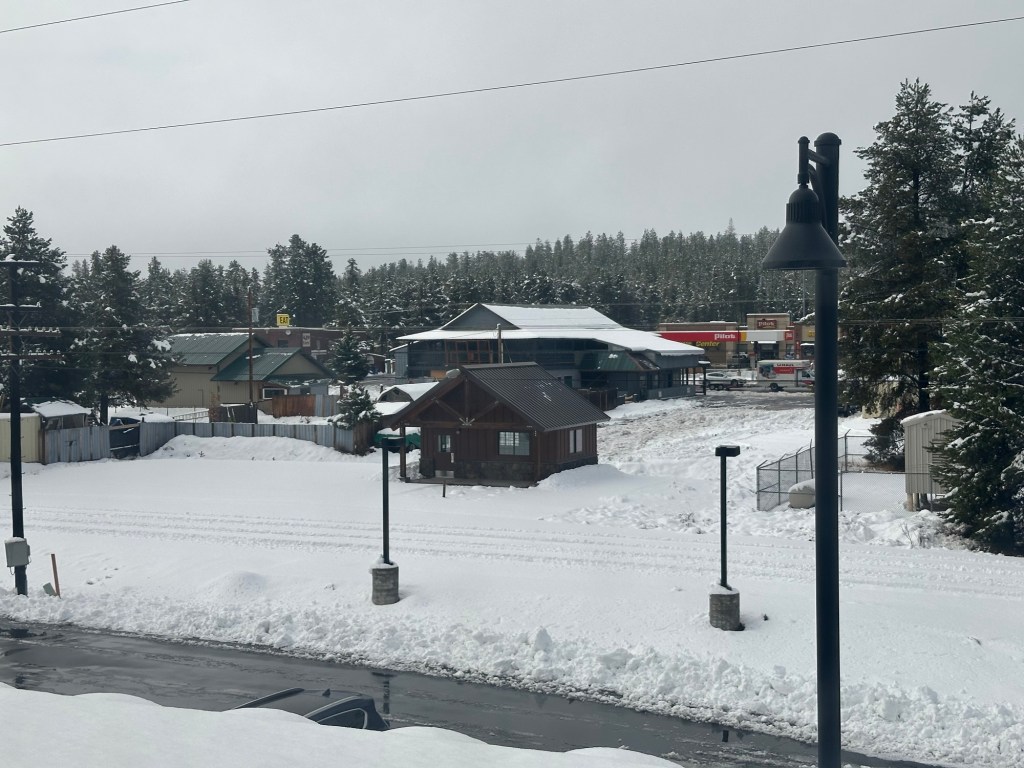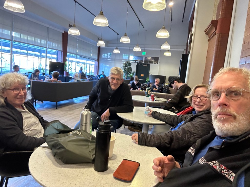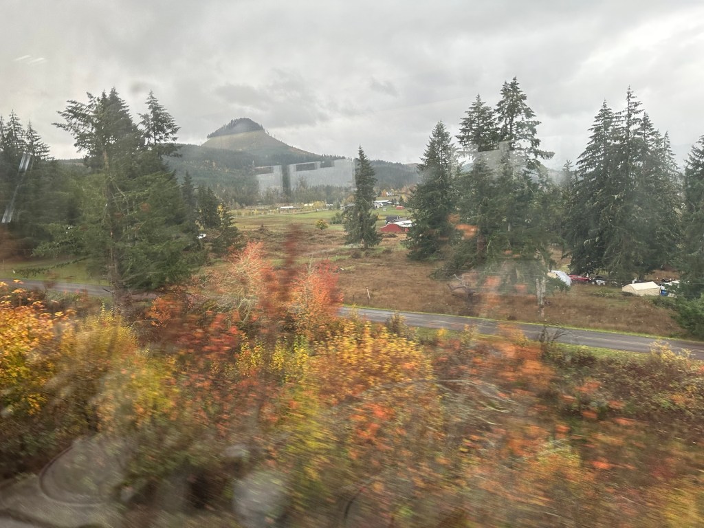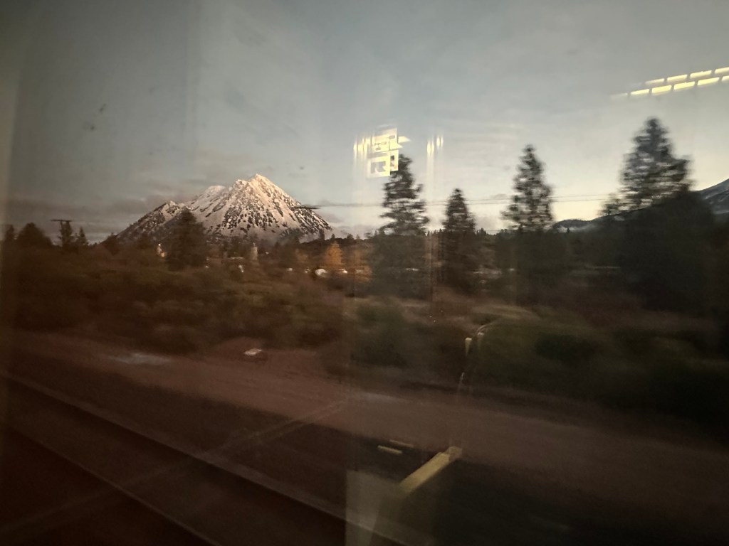 Our last night on board and had the usual gyrations, and stretches into awkward positions achieving a great night of sleep. Awoke in the dark, but figured sunrise would be soon, so gyrate from bunk down to the observation car. Mt Shasta soon appeared. Then into snow and tall rainy trees in Oregon.
