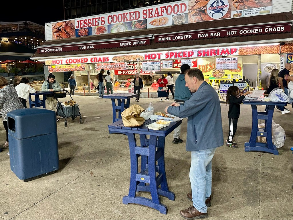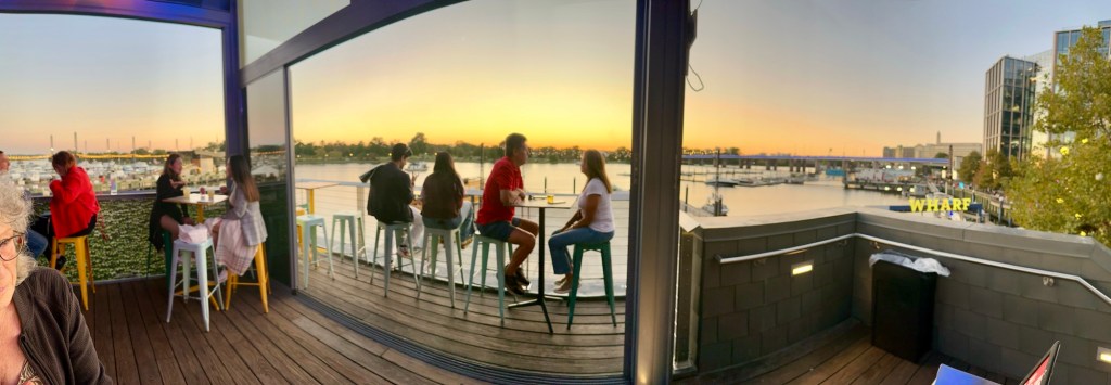 Looking for a beer after the Anacostia river joined the Potomac and entered the walkway along a slough of the Potomac, with lots of high end restaurants. Not our desire. Then a place up on second floor overlooking the slough, with boats heading in and out at sunset. The bouncer apologized as they only had beer and booze, no food. Perfect! Another block and a crab market where we got a cup of chowder each. Not very good chowder either. Shrimp chowder devoid of shrimp and the clam chowder OK, but nothing exciting, needing some spices. Then a walk back to hotel along the national mall and numerous office buildings, museums, and federal whatnots. In the end nearly 9 miles today of concrete walking.