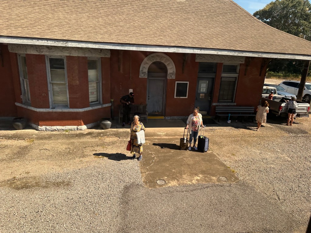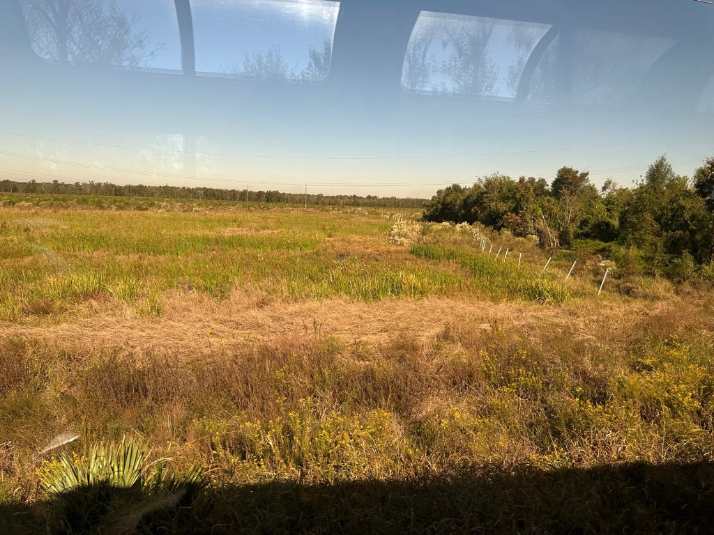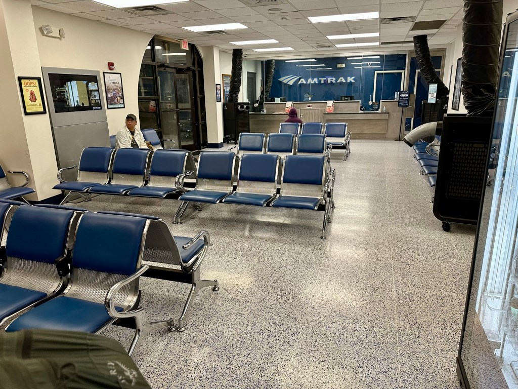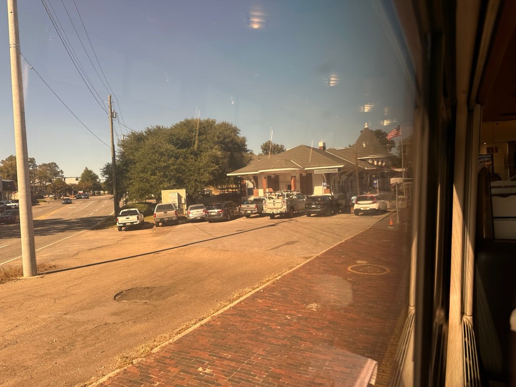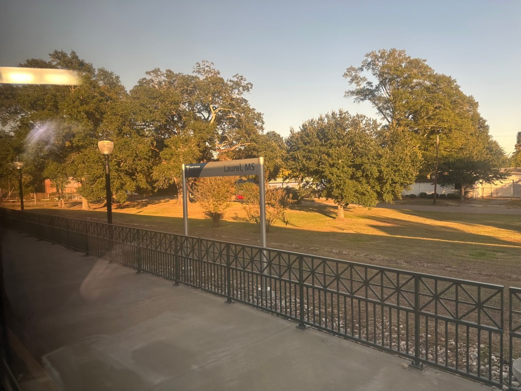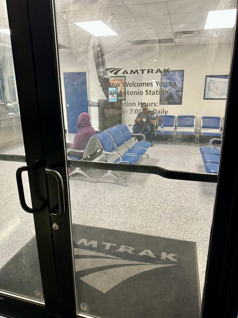 The Mississippi River delta was interesting with its almost swamp land. Someone said they did see an alligator. I might have seen one swimming but unsure. Arrived Houston on time and sat for an haour and half waiting for the built in fudge factor not necessary this trip. Went into the Houston station and the worst station yet. Apparently “they” tore down the beautiful union station in the 1970s, with the intention of building a better one but they forgot that part, and now have a bus terminal. We arrive San Antonio at midnight, apparently to a similar station, although they do have a very nice ornate train station to be rented out, but not for train use.