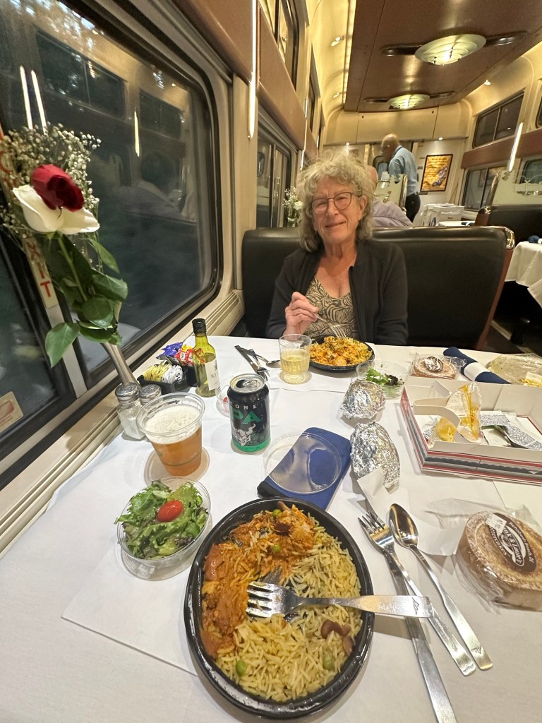 We ask people on the train- “Why the train?” Most we have talked to just want the experience of the train, or to see the country. One stated they like the train as do not have the patience for the troubles of flying. Each to their own reasons, all valid, all different. But as I was talking with 2 couples this morning the train is not for the weak hearted. Contorting into the bedrooms requires some finesse. The empire builder from Portland to Chicago was the only one with a lounge observation car. All have had a dining car, (food is included with sleeper accomadations), but it is busy and one can’t really hang out there. There is a cafe car, but not with the large windows. the lounge was a wonderful place to watch and talk with others, we miss it, spending more time in our roomette, feeling a bit like bad kids sent to our room. We are realizing this is a very expensive trip, why I am not sure, although half the expense is the sleeping horizontal and not in coach class. But then airline first class is also very expensive. Maybe I have gotten soft?
