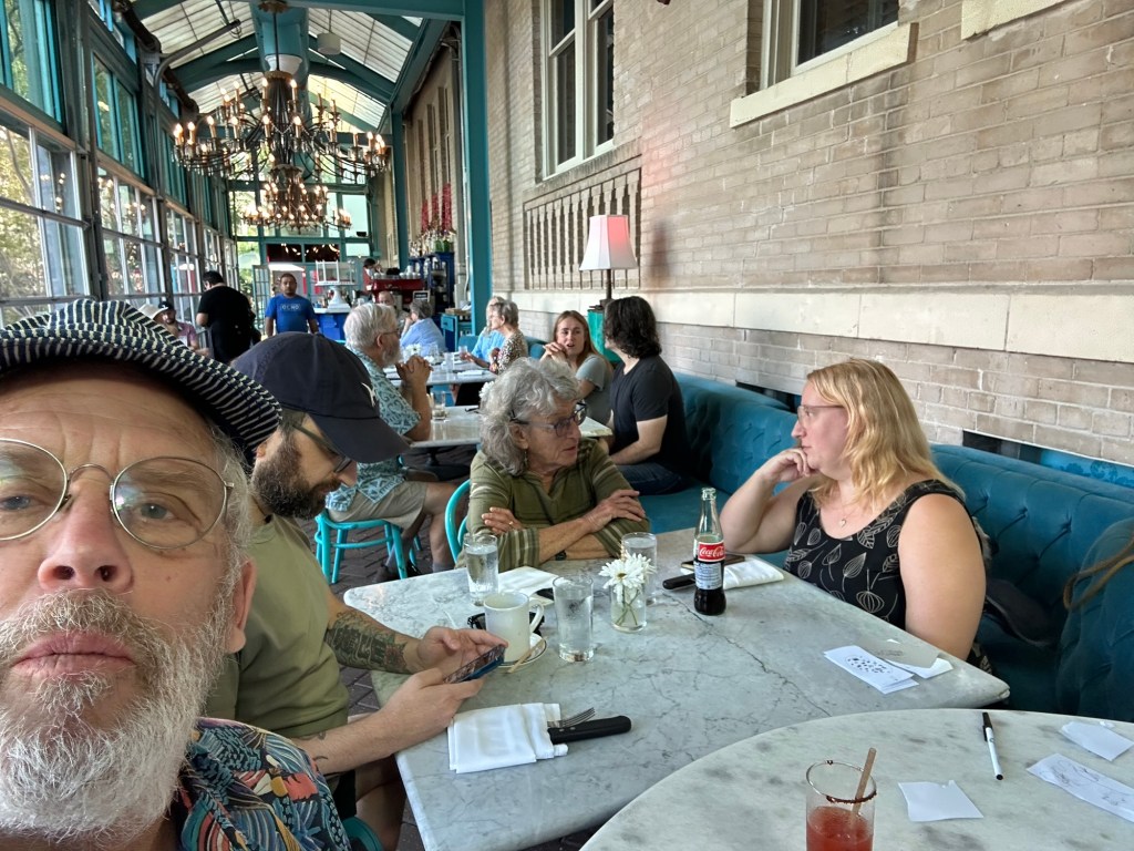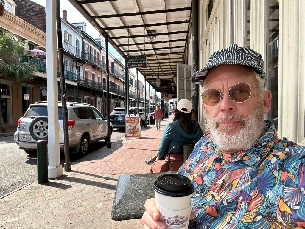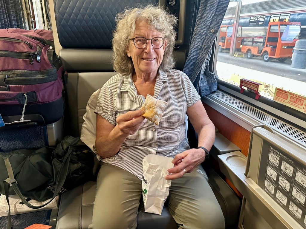 Yet another delightful evening just sitting at Judy’s house reading, conversing, I got to fix some loose wiring on the roof eves, drinking wine and general enjoyment of life. A quick drive this am to train and off we go again. Judy insisted we get some beignets, (New Orleans doughnuts) for the ride. Square donuts without holes covered in powdered sugar, delivered in a paper sack overfilled with more powdered sugar.