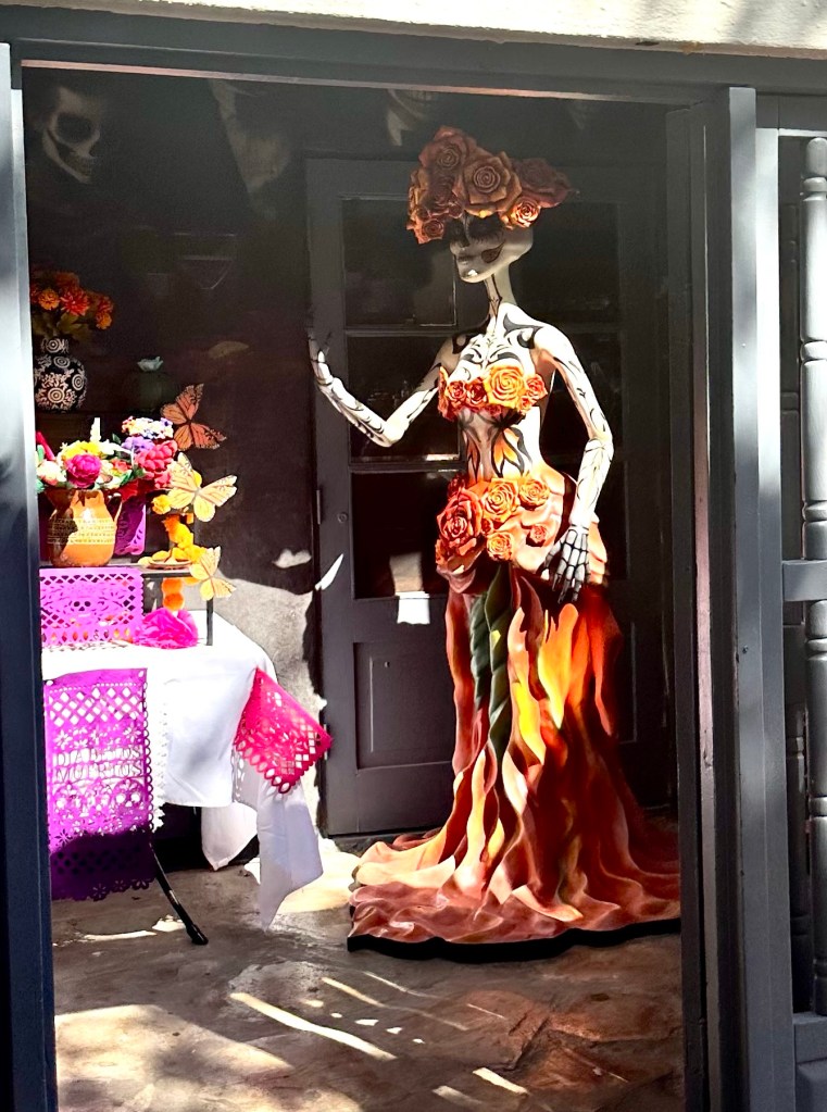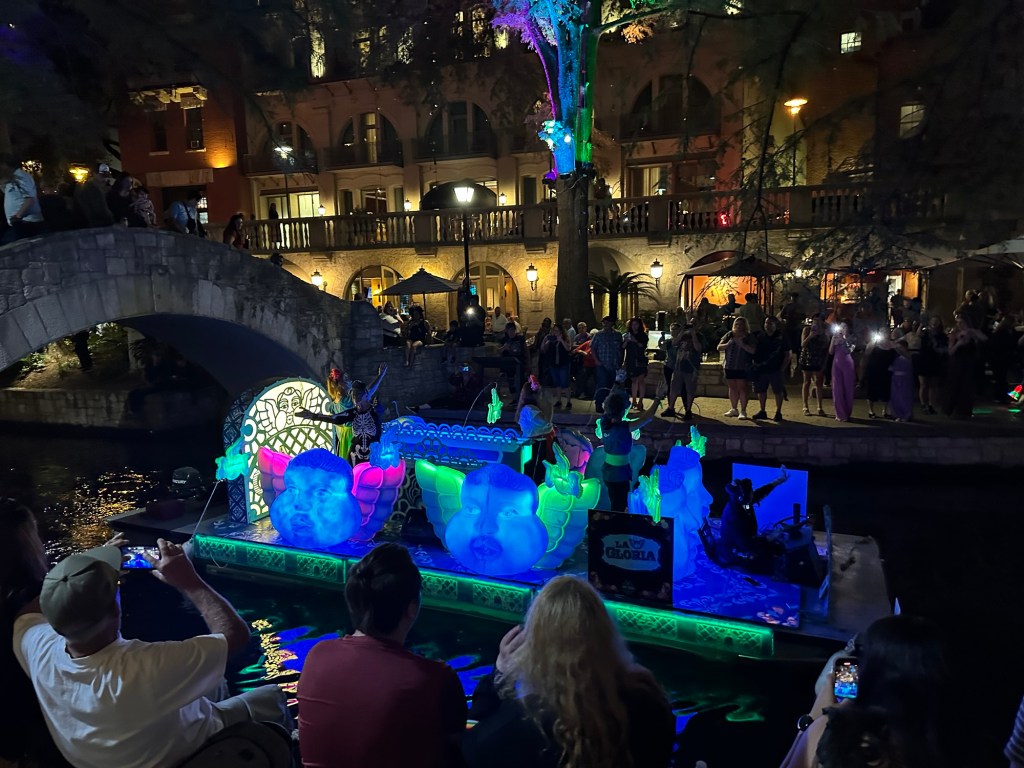 Had the night and first part of day to ourselves so caught up on sleep, (finding the train a bit difficult to sleep), a great breakfast at hotel, and off to the famous San Antonio River walk. It proved delightful although after the sidewalks and streets of New York, Washington DC, and New Orleans, rather narrow but very nice. Turns out San Antonio is 64% Hispanic and Halloween a big deal. Not the Halloween as in the United States, but Dia De Los Mujertos, the day of the dead , the celebration of one’s ancestors. Obviously a big deal, and they have moved the holiday to this weekend and next weekend, and I assume as well as the real holiday on 1 November. They have a parade and downtown river walk, and the sidewalk was lined with folding chairs for selling seats to the parade. We just walked up the river about a mile and back. Quite a delightful urban environment. Built over the last one hundred years or so to combat flooding, but has turned into a real treat in the city.
