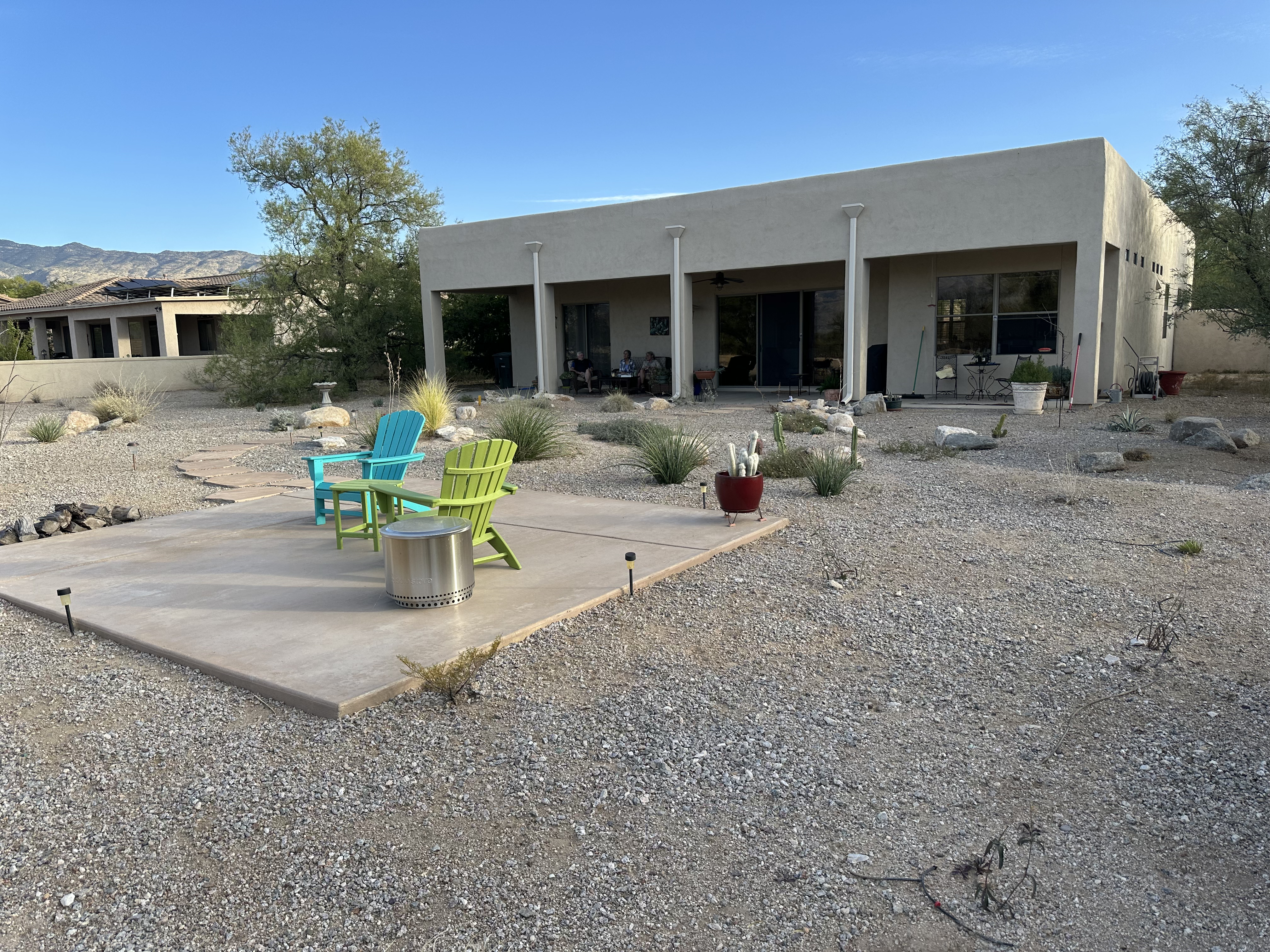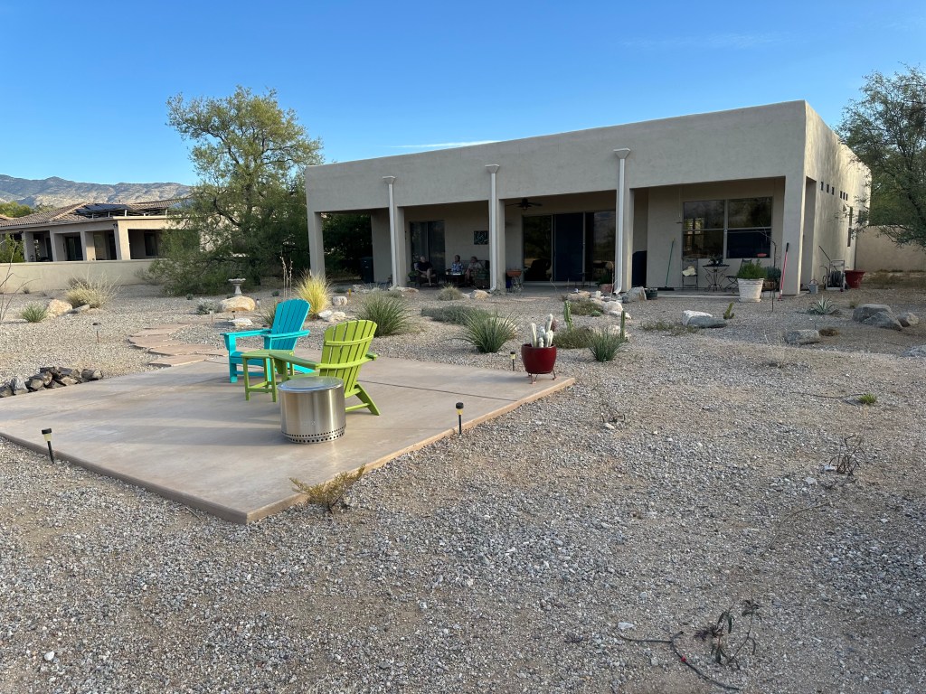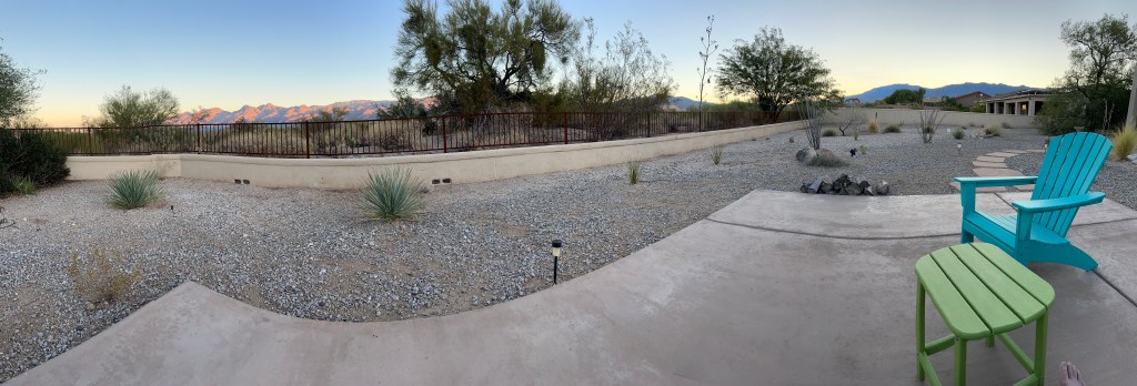 Their home is delightful, roomy and a backyard landscaped as all yards here in desert motive. They removed the scrub when moved in and planted a variety of cactus and plants. There is a patio in the back which is incredible for looking at stars, the sky, and sitting and drinking coffee in the morning watching and feeling the sunrise. Sunrise over the Rincon mountains to the east, with blasts of the first sun onto the Santa Catalinas and Mt Lemon, rising 9170 feet above sea level. (2795 meters). Sunset show alpenglow over the Catalinas. I love it, with desert down here.