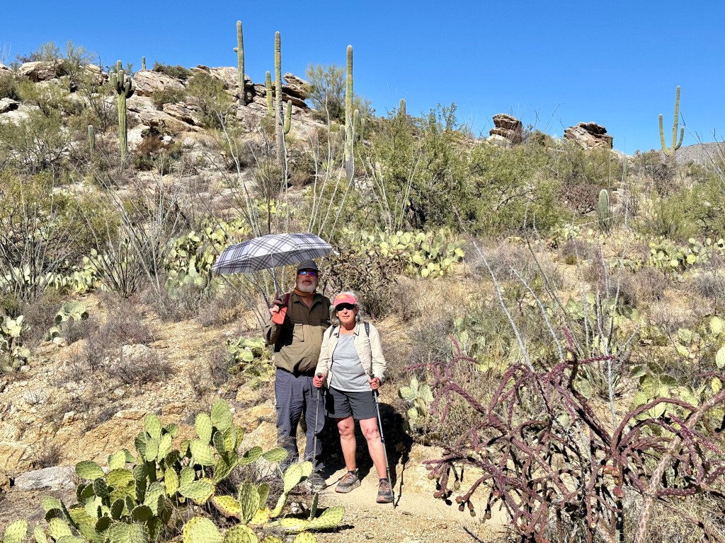 A wondrous ride into Tucson, continuing through the Chiahuahuan desert and now into the Sonoran desert, arriving 15 minutes early and our friends just arriving same time. A drive to their beautiful home purchased a few years ago. They had lived in Alaska for years but time to become snowbirds. Camille more than Joe. He loves it here year round, Camille loves it in winter but the heat bothers her. Alas I do believe there is no perfect place. Tucson’s personality seems to be desert, although people have not necessarily adapted to the desert. They still maintain a daytime routine standard american life. But it is beautiful.