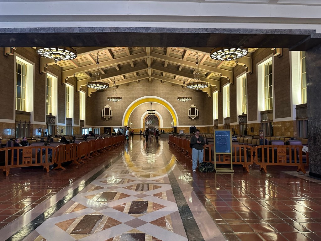 The Backing up a bit in time, to Los Angeles, we had thought it would be just a 3 hour layover and change trains from the “sunset limited” from Tucson to the coastal starlight. We arrived 1/2 hour early so 5 am and a 09:51 departure. Dropped our bags in lounge and I went for a walk. 2 days before the Los Angeles dodgers won the World Series, and they arrived home to celebrate. Seems there was to be a parade and people were arriving to begin festivities at 6 am. People arriving on trains and heading to dodger stadium.