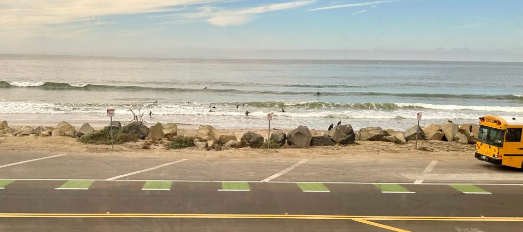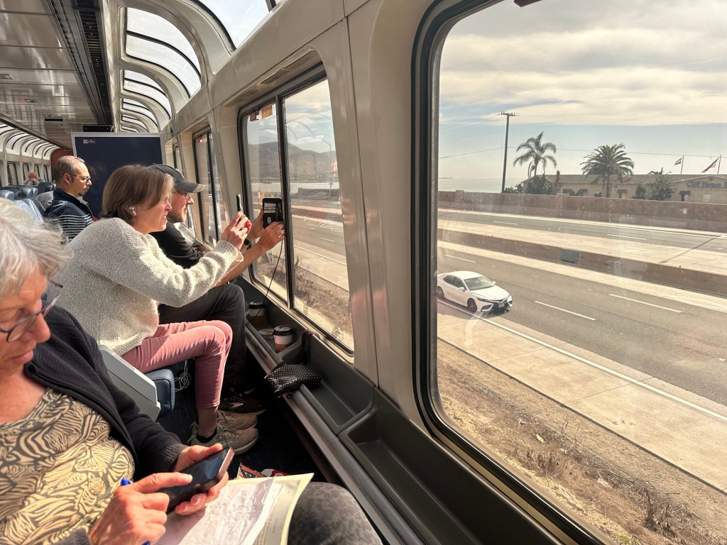 Oh my gosh. I have an additional must do thing before you die. This train the “coastal starlight” is amazing. It is our last train finishing this little circumnavigation and it is great. I had seen pictures of it along the coast but reality is always different. About Ventura, California we arrived and cruised for hours along the coast. The Pacific Ocean was calm but even so, surfers, picnickers,walkers bikers all enjoying the day.